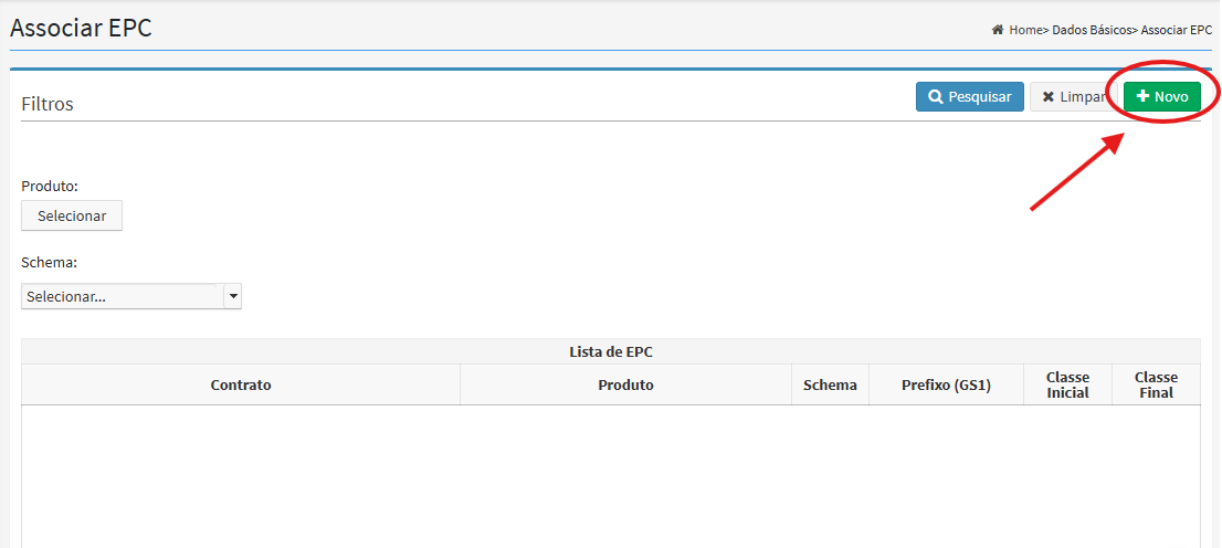 Na página de Associar EPC, vamos clicar em “Novo”.